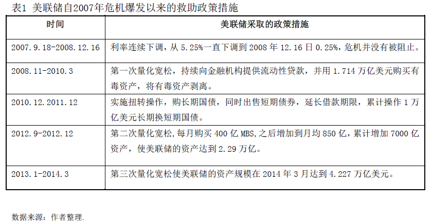 传统的经济周期理论认为,一国经济必然要经历“危机—衰退—萧条—复苏—繁荣—危机”这样一个周期性过程,并且每一次经济复苏都会在市场出清之后开始,每一次经济衰退都会在繁荣泡沫破灭之后产生。但美国2008年发生的危机,却并没有遵从这一周期规律。危机之前很少有学者认为美国经济不健康,危机之后大多数经济学家认为美国经济在短期内难以复苏。事实上,美国经济却奇迹般复苏。美国经济并没有出现大多数经济学家所预期的要经历一个较长期的经济萧条和市场出清过程,一个非常明显的原因是,美国这次金融危机之后美联储执行了一系列救市和量化宽松政策(见表1)。这是否意味着在央行无限量化宽松的货币供应条件下,经济或金融危机的周期可以被打破?危机是否可以完全通过货币当局的调控政策被消除?