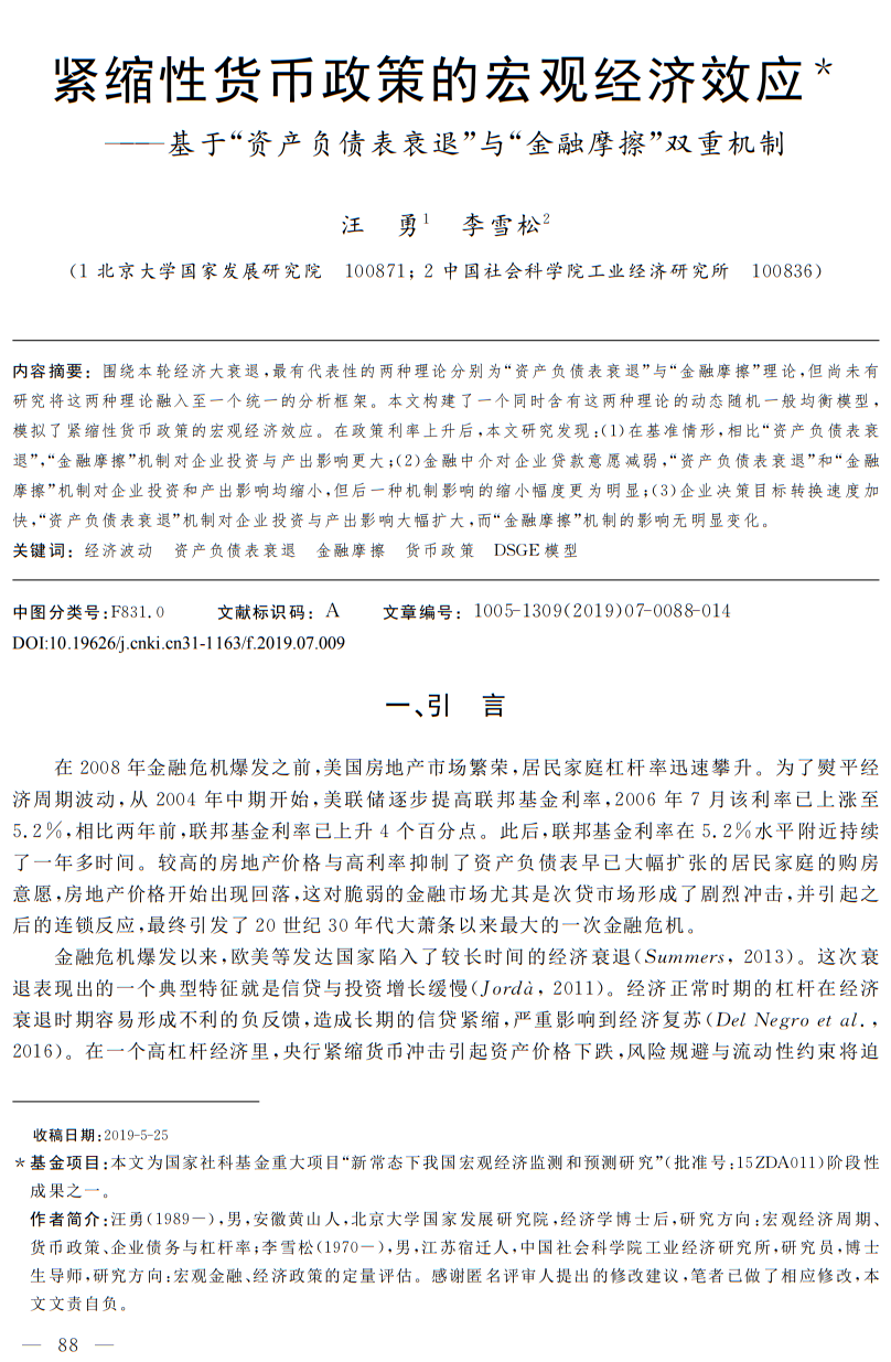 汪勇,李雪松.紧缩性货币政策的宏观经济效应——基于“资产负债表衰退”与“金融摩擦”双重机制[J].上海经济研究,2019(07):88-101+114.