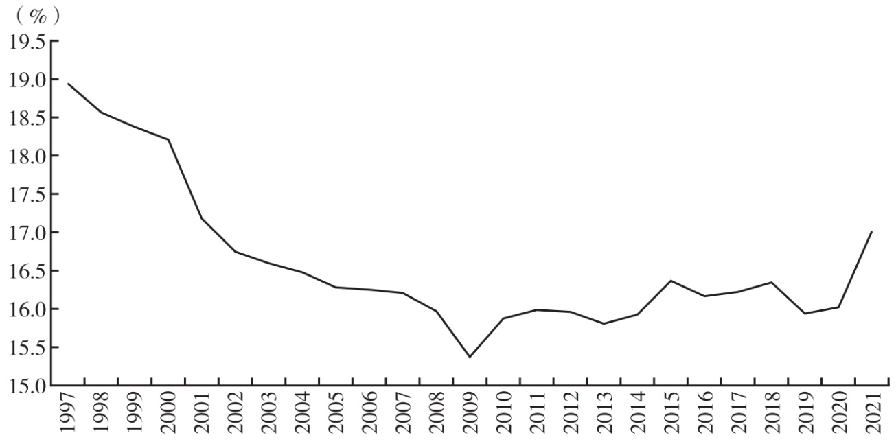 按照传统的产业结构演变规律,随着人均GDP的提高,产业结构趋于高级化指产业结构逐步从低级形式转向高级形式,由第一产业占主导向第二产业、第三产业占主导演进,这被称为“库兹涅茨”过程。其中,制造业比重的长期下降多年来也被认为是一个经济体进入到高收入的后工业化社会的重要标志和共同特征。研究表明,当一个经济体的人均GDP达到1万国际元(以1990年国际元来计算),制造业占GDP比重处于30%—40%之间,这一般是中等收入国家的工业化和城市化快速推进阶段;随着人均GDP进一步提高,制造业份额会逐步下降,当人均GDP达3万国际元时,制造业份额甚至会低于10%。但是,数字经济发展在一定程度上对上述规律形成了挑战。首先,数字经济的发展,使得制造业出现从“微笑曲线”到“武藏曲线”的反转,使其成为高附加值的行业,此制造业已不是彼制造业。其次,发达经济体主动对产业结构做出修正。为尽快克服2008年国际金融危机的影响,以美国、日本和德国等为代表的发达经济体,开始重新审视制造业的作用,实施促进制造业回归政策。这说明近百年来,发达经济体产业结构的变化有向其他国家转移低附加值、高污染的产业的因素。此外,传统的产业结构演变规律是在工业技术范式下的产业发展规律,而新的数字技术范式出现后,产业发展出现新的变化。近年来,全球制造业在全球GDP中的占比一改下降趋势逐步上升(见图2),在一定程度上说明数字技术对制造业的提升作用。2021年,中国工业增加值占全球的比重超过25%(见图3)。
