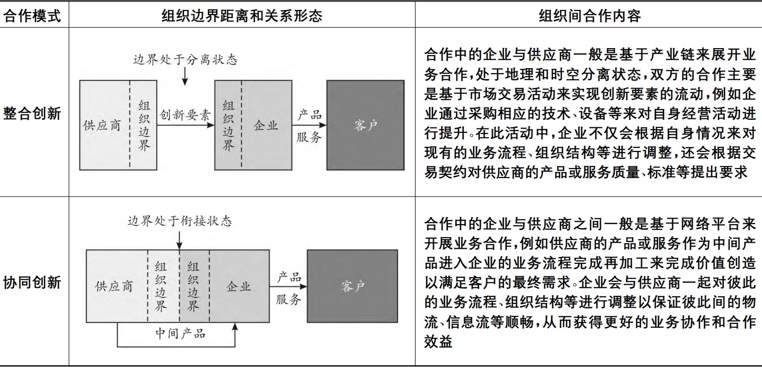 出于获取所需资源,降低生产运营成本,以及提升市场竞争力等诸多因素的考虑,企业会与其他的组织或机构建立恰当关联来进行合作以满足最终客户的需求[14]。然而在组织间合作的过程中,彼此的关系不仅受到外部环境因素的影响,也会受到组织内部因素的影响,且都是通过围绕组织边界的相关活动表现出来。组织边界是企业在市场化活动中与周围环境的界限(或界线),涉及法律规定的权利、义务的分配等[15]。Thompson[16]认为,组织边界能有效分离内部与外部,其好的一面在于能够保持内部运行的稳定性,阻隔外部环境动态的影响,并能产生增加学习机会、接触互补性的资源等正向作用[17];不好的一面在于阻隔了资源的自由流动,会导致知识固化、加剧市场竞争等负向作用[18]。Hirschhorn和Gilmore[19]指出,只有有效处理围绕组织边界内部活动与外部活动的资源配置,组织间合作的效率和效能才最高。合作模式的选择与组织边界存在根本性关联,企业需要谨慎处理发生在组织边界的相关活动,并根据不同的情形来选择合适的合作模式才能更有效支持创新活动开展,其中比较典型的合作模式包括整合创新和协同创新。