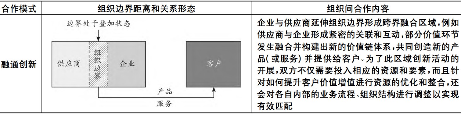 基于对实践活动的探索与创新,一些企业开始采取跨界活动与外部环境中的利益方建立直接联系以应对日益增加的复杂环境和创新任务的需要。Ancona和Caldwell[43]指出,作为一项动态和复杂的行为模式,跨界活动只要使用得当,都会为企业带来短期或长期的效益,甚至能塑造持续的竞争优势。在融通创新的合作模式下,双方的组织边界会出现延伸和拓展并形成交汇叠加,不仅确定了新的组织间交互机制,而且也形成了组织间的互嵌关联,从而产生新型的组织间关系(见表2)。跨界融合是合作双方在组织边界建立融合叠加区域,通过彼此的相互嵌入对工作流程、业务模式、组织结构等进行重构,促进组织间开展多层次、全方位和立体式的整合与协作,推动人员、信息、技术等方面无缝衔接,最终形成共同体的状态。例如,企业可以通过派驻跨界团队嵌入合作方的组织边界内部来从事特定的知识创造活动,包括广泛且深入地参与到直接面向客户业务环节中来共同提升价值创造活动的效率和效益。由于融通创新的跨界融合特征超越了传统观点中对组织边界的限制和约束,强调可以跨越组织边界将异质性组织关联起来形成共栖,能够有效防止机会主义行为,降低组织间的隔阂和壁垒,实现人、物、信息等方面的良好流动和匹配,从而保证了合作的顺畅开展。