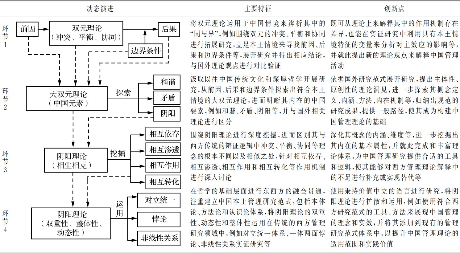 中国情境不但能用于检验现有理论,也能拓展、挑战甚至重建理论[27],且能向西方主流管理领域贡献中国管理理论。就如中国管理理论的发展早期,立足于本土情境先后产生了市场转型、网络资本和关系等一系列的理论。在最近十年,诸多的学者通过借鉴西方研究范式,挖掘本土情境因素等一系列工作的开展,提出了和谐管理、儒家式领导等中国特色的管理理论。但是,依然面临既要研究中国问题提炼中国管理思想,又要融入全球管理学共同体来发表国际管理学界认可的学术成果的现实情形。针对此,学者们也提出了一些思路来加以解决,强调需要根据情境来做好管理理论的建构与创新[4,32];然而,其中的具体形式、路径和内容是什么,以及如何实现,则没有展开详细阐述,也鲜有研究较为系统化地梳理和明晰中国管理理论建构与创新的内在机制和演进路径。本研究以二元理论的情境化及阴阳理论的发展路径作为范例,来帮助观察管理理论从引入学习到自我建构,再到创新扩散的全过程,试图从中归纳出“中西交融”不同阶段和环节的主要特征、创新点方面的显著差异,以及层层递进的演进机制(见表1)。