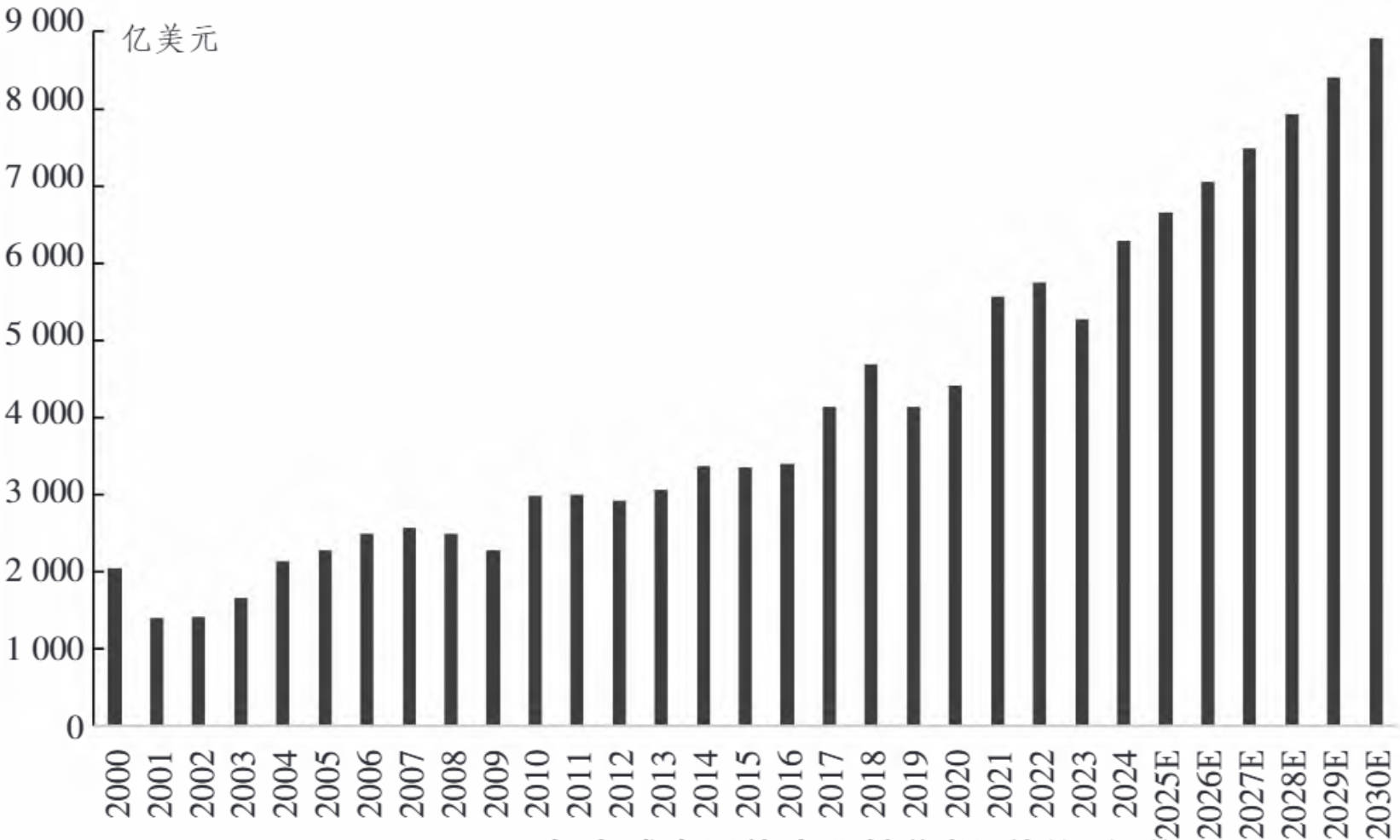 图1 2000—2030年全球半导体产业销售额(单位:亿美元)