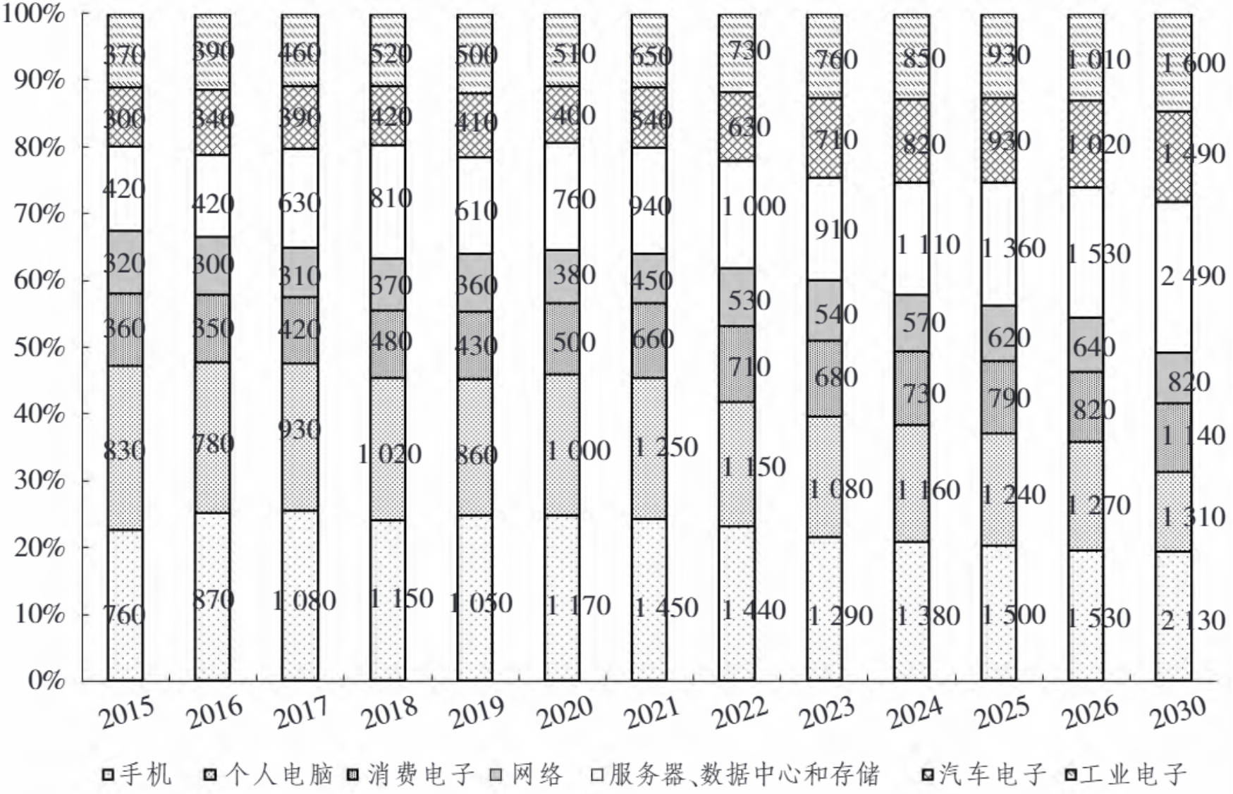 图2 2015—2030年以终端用途分类的半导体产业市场规模(单位:亿美元)