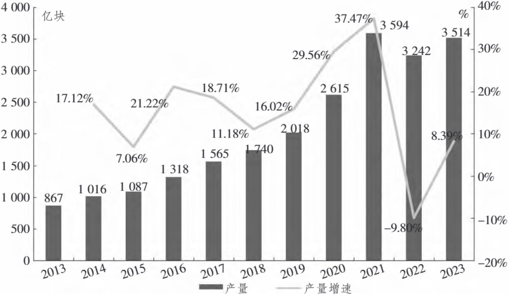 “十五五”末,中国集成电路产量将突破6 000亿块,产值超过1.5万亿元,占全球集成电路产能的比重保持总体稳定态势。为应对美国等西方国家的“脱钩断链”,中国近年来加大对半导体领域的投资尤其是制造环节的投资,以保证中国在全球集成电路产业的安全供应和市场地位。根据国家统计局数据,2023年中国的集成电路产量为3 514亿块(见图4),2013—2023年复合增长率达15.02%。在2022—2023年增速有所下滑的背景下,预计未来能保持较高增速,以8%~12%的增速计算,预计2030年中国集成电路产量将达到6 000亿~6 200亿块。另据美国半导体行业协会和波士顿咨询公司的报告预测,2022年中国的晶圆产能在全球占比24%,预计2030年会下降至22%。按照美国半导体行业协会(8 903亿美元)、ASML(10 980亿美元)、麦肯锡(10 650亿美元)对2030年的预测数据,2030年中国半导体的产值将超过1.5万亿元。