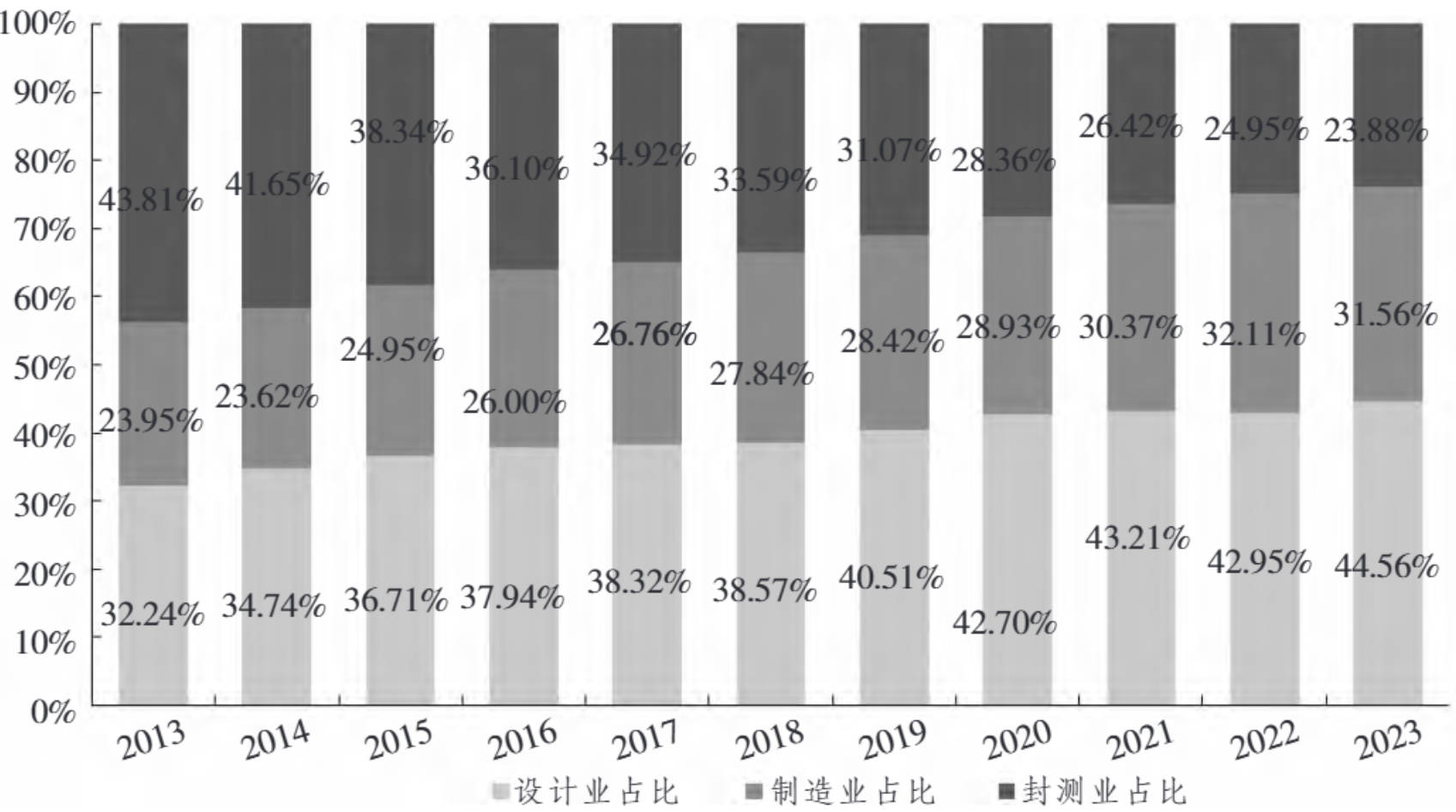 图5 2013—2023年中国集成电路产业三大环节结构变化情况