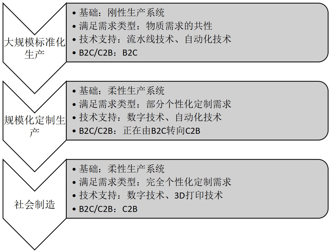 首先,制造业模式与业态创新的基础发生了变化,即从刚性生产系统转变为柔性生产系统。在市场供不应求和机械自动化时代,制造企业以刚性生产系统为基础(例如,福特制以大规模标准化生产和垂直一体化为特征)建立了大规模标准化生产,既适应了当时的技术进步,又通过单一(或少品种)大批量生产满足当时的需求。但随着经济不断发展、技术日新月异,市场需求逐渐趋向多变,以刚性生产系统为基础的大规模标准化生产虽然可以生产满足消费者共同物质需求的产品,但其缺乏灵活性,无法满足消费者的定制化需求或精神需求,难以适应快速变化的市场环境。在这一背景下,制造业开始寻求改变,使刚性生产系统逐步转向柔性生产系统。制造企业的生产系统柔性化能够使企业在现有技术条件下快速利用、组织各种要素高效高质地生产多样化产品以满足市场需求,抵御市场潜在风险并提升产品竞争力。