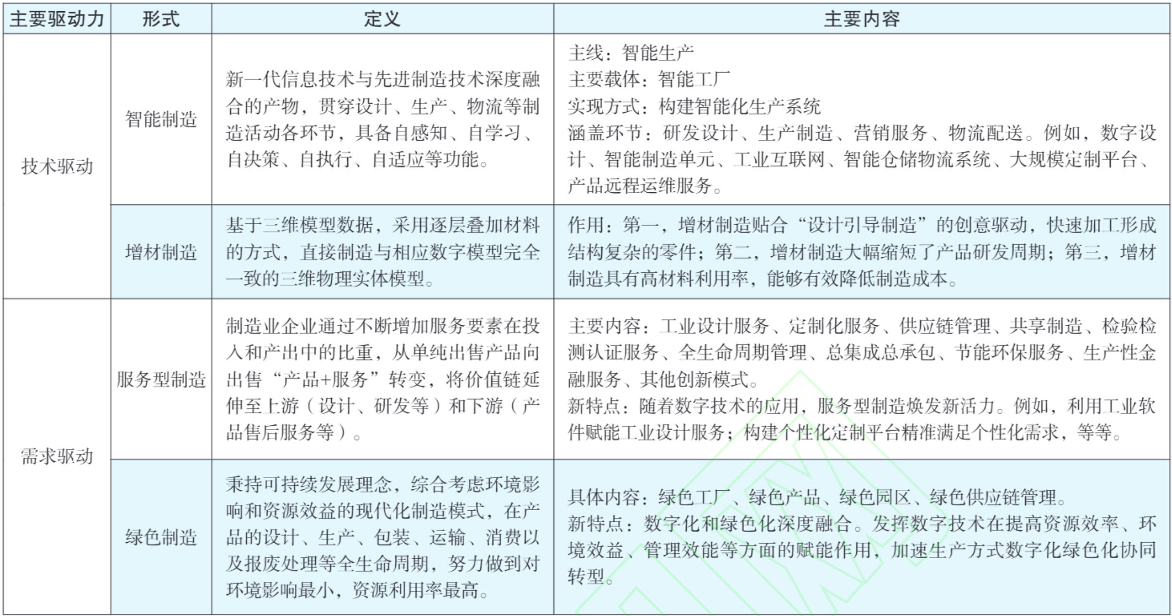 在技术驱动和需求结构变化牵引下,制造业模式与业态创新演化出四个基本类型:智能制造、增材制造、服务型制造和绿色制造(见表1)。