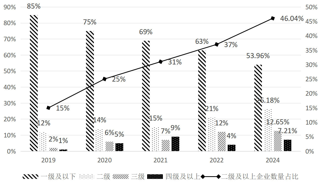 图2 2019-2024年我国智能制造能力成熟度等级分布情况图