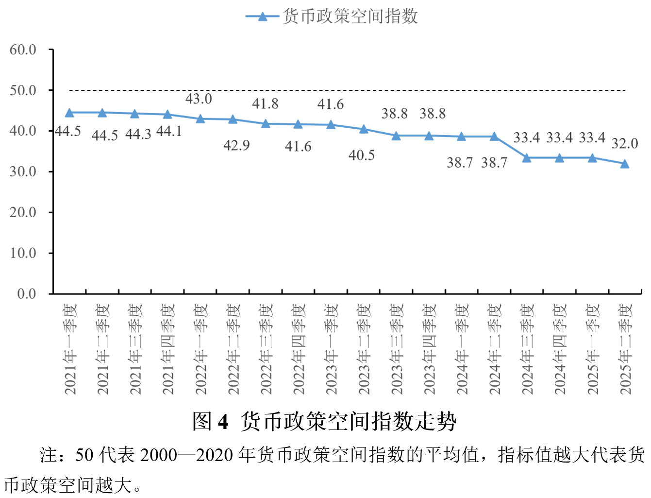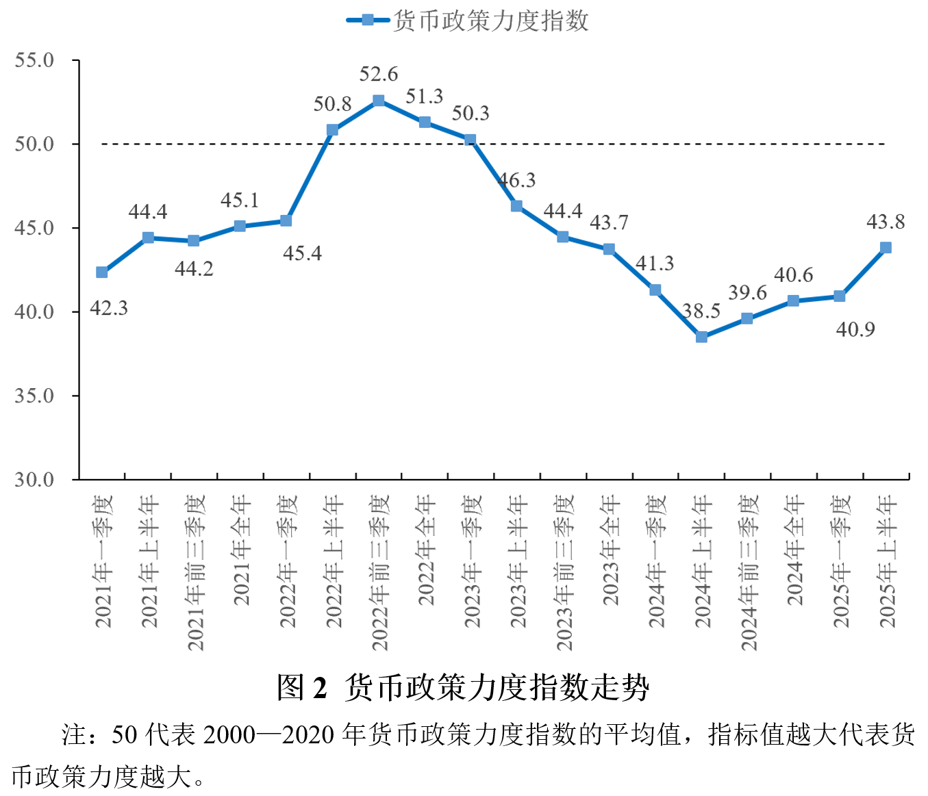 2025年上半年货币政策力度指数为43.8,比一季度升高2.9,表明货币政策力度有所加大。这主要归因于5月份的降准和降息操作。为了落实4月底中央政治局会议提出的“加强超常规逆周期调节”要求,中国人民银行自5月15日起下调金融机构存款准备金率0.5个百分点(不含已执行5%存款准备金率的金融机构)。降准和MLF等多方面操作投放的中长期稳定资金,带动M2同比增速从一季度末的7.0%升至二季度末的8.3%,社会融资规模存量同比增速从一季度末的8.4%升至二季度末的8.9%,二者均达到最近五个季度的高点。与此同时,中国人民银行自2025年5月8日起实施降息操作,将公开市场7天期逆回购操作利率由1.5%下调至1.4%。贷款市场报价利率(LPR)在5月20日同步下调10个基点。在降息操作的带动下,社会综合融资成本继续低位下行,1—6月份新发放企业贷款加权平均利率比2024年同期下降约45个基点,新发放的个人住房贷款利率比2024年同期下降约60个基点。