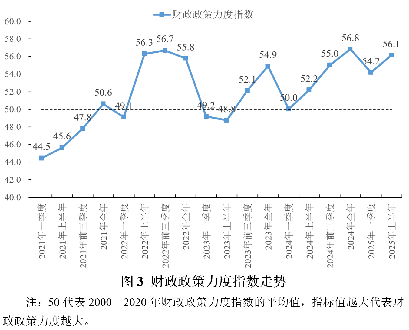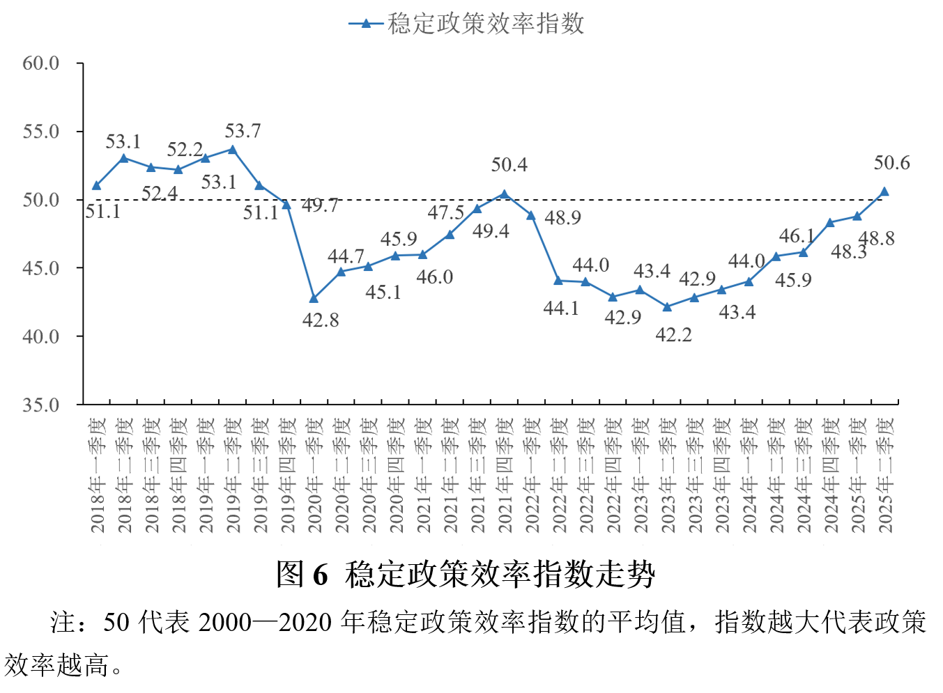 2025年二季度稳定政策效率指数为50.6,连续8个季度回升,表明政策传导效率持续改善。从构成稳定政策效率指数的子指标来看,货币政策方面,2025年二季度GDP/M2增量指数为57.4,GDP/信贷增量指数为51.7,分别比一季度上升3.2和2.2。财政政策方面,GDP/财政支出增量指数为44.6,比一季度上升0.2,GDP/政府债务增量指数为39.6,比一季度上升0.2。总体上看,2025年二季度货币与财政政策效率双双改善,政策取向一致性与政策协同性不断增强,对稳定政策整体效率的提升起到了积极作用。