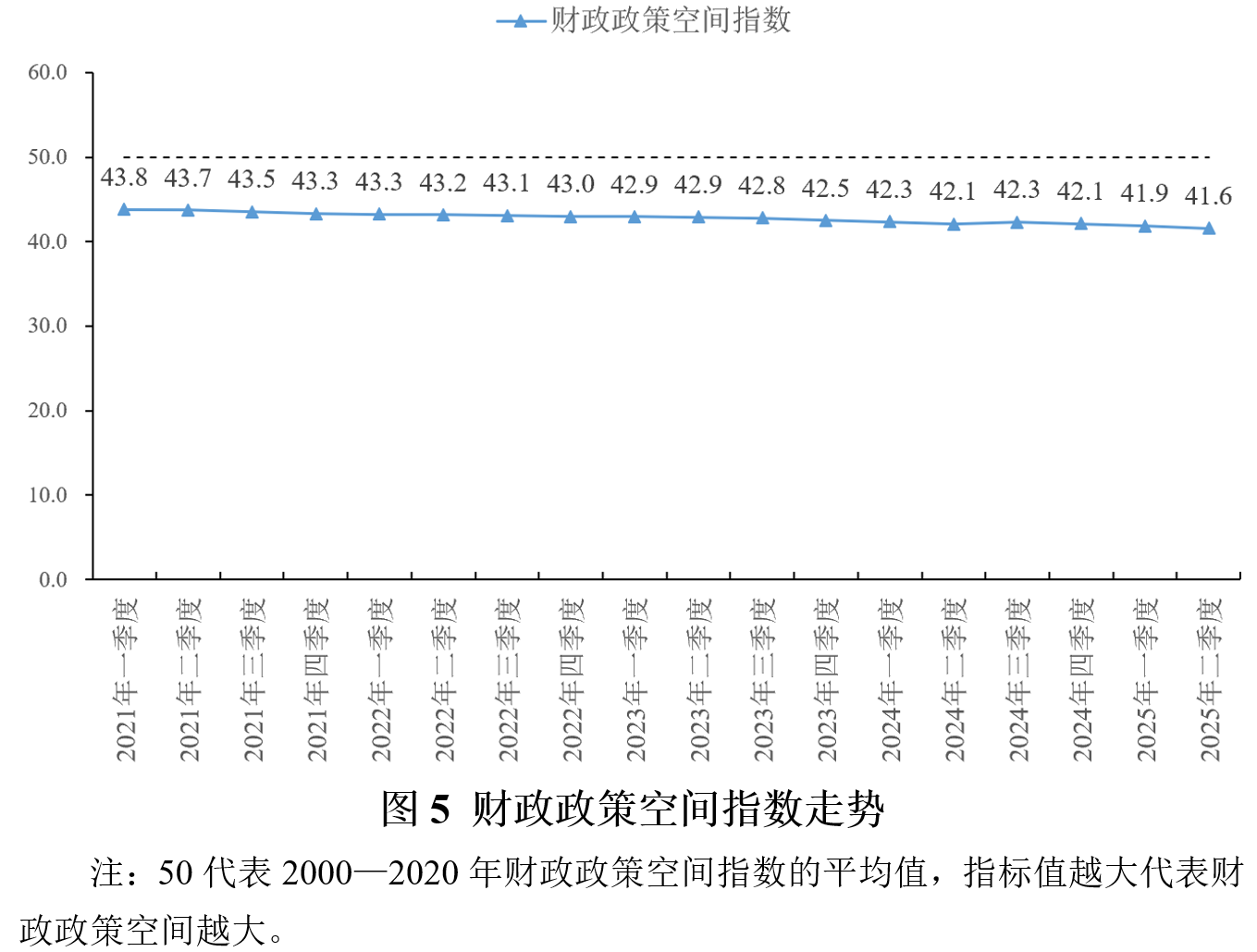 2025年二季度末财政政策空间指数为41.6,比一季度末略微下降0.3,源自财政部采取更加积极的财政政策应对经济下行压力,同样是当前经济形势下的合理举措。近年来,伴随着积极财政政策的持续发力,中国的政府部门债务率(政府部门债务占GDP的比重)缓慢升高。中国社会科学院国家资产负债表研究中心(CNBS)数据显示,中国的政府部门债务率已经从2020年一季度的40%升至2025年一季度的63.2%。2025年以来,伴随着更加积极的财政政策有效落地,政府部门债务率不可避免地有所升高,使得财政政策空间趋于收窄。