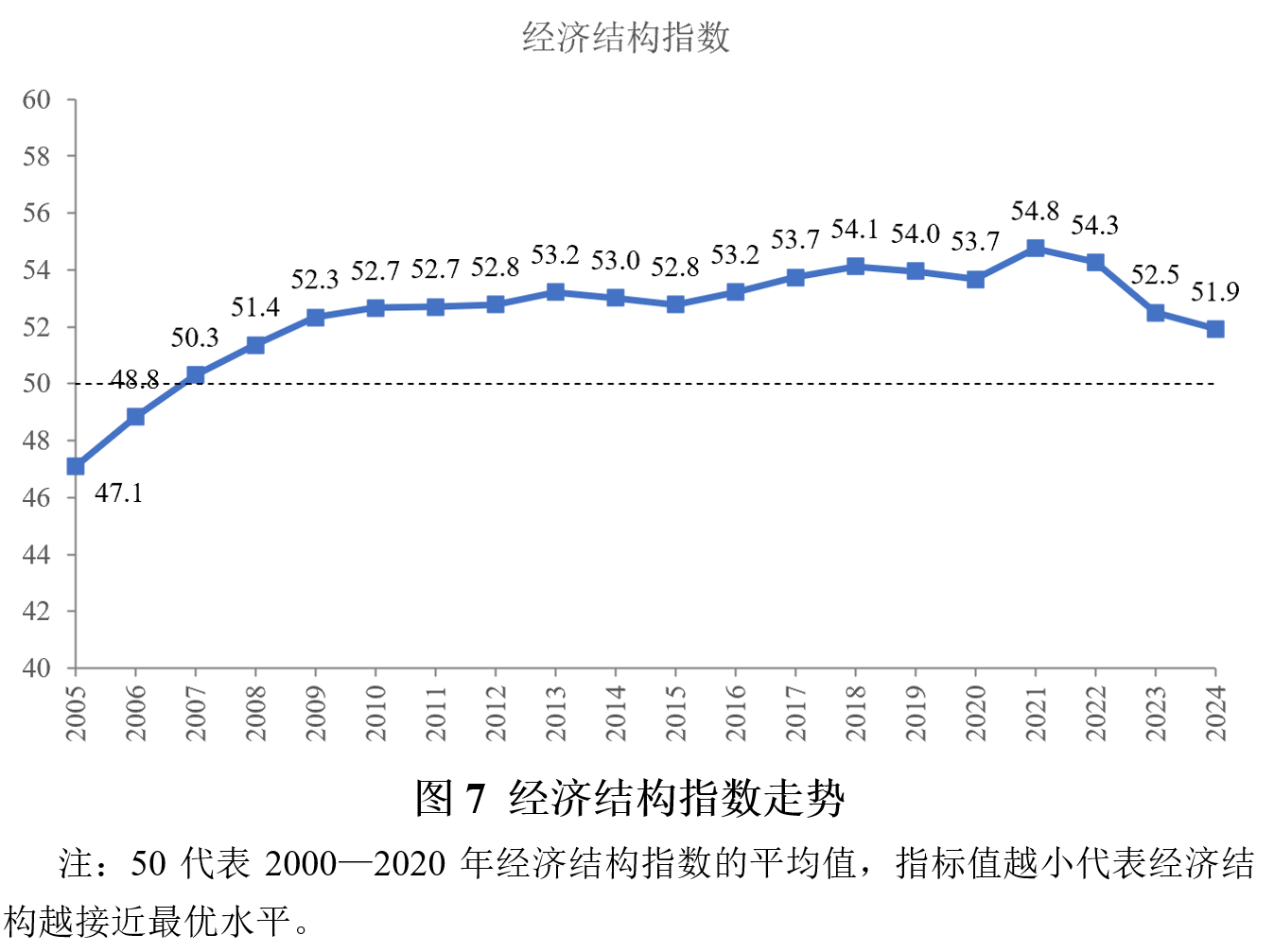 2024年经济结构指数为51.9,连续三年下降,表明经济结构持续优化。这主要得益于居民部门消费率提升带来的总需求结构改善,以及TFP和人力资本对经济增长贡献率提升带来的总供给结构改善。